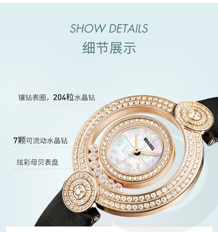 正面就能直观的看到腕表的机芯之美,41毫米和37毫米的表壳直径也为人们提供了更多的选择。所搭载的机芯也均经过了特殊涂层的处理,为了搭配不同的材质,每一枚机芯的处理都经过了重新的考量。此外,几枚新品都采用了彩虹圈的表圈设计,也就是我们接下来要说到的宝石镶嵌工艺。