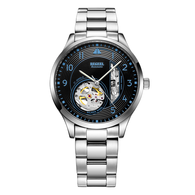 仰望仓穹,北斗七星中格外闪亮的天狼星,银白纯洁之光闪耀天际。设计师以此为灵感利用不规则镂空设计打造个性盘面,方寸之间尽显三维立体。夜光刻度圈凭借细腻日内瓦纹从外圈上跃然而起,搭配强夜光指针,令人眼前一亮,为其命名为天狼星,寓意「梦帆启航,发光发热」。